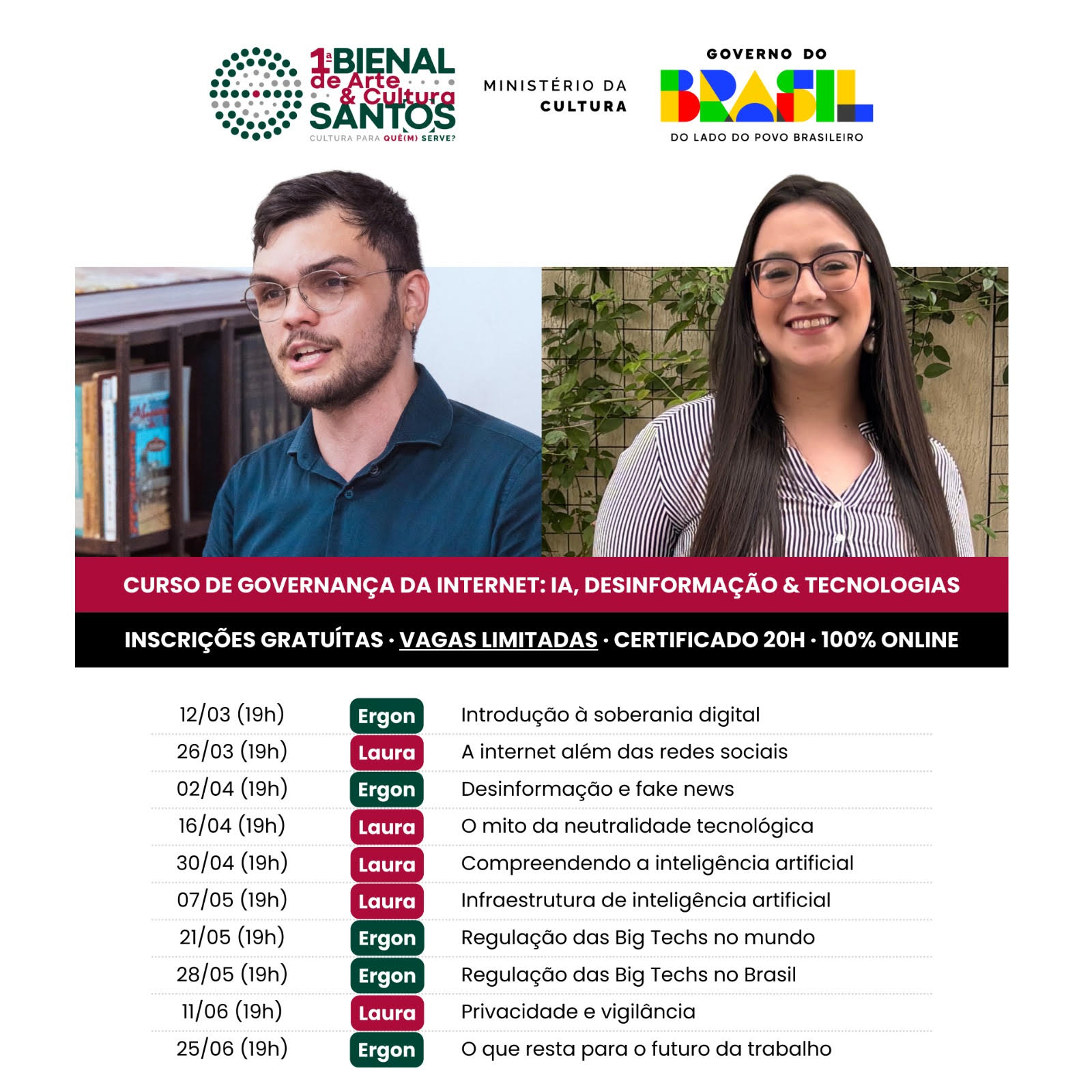 Promovido pelo Instituto Sindest em parceria com o Ministério da Cultura, o curso Governança da Internet: IA, desinformação e tecnologias tem como objetivo aprofundar os conhecimentos sobre inteligência artificial, enfrentamento à desinformação e tecnologias emergentes. O curso é oferecido gratuitamente na Bienal de Arte e Cultura do Instituto Sindest, realizada na cidade de Santos, um projeto voltado à promoção da produção artística, formação cultural e democratização do acesso à cultura. As aulas são ministradas pelos especialistas Ergon Cugler e Laura Rodrigues.