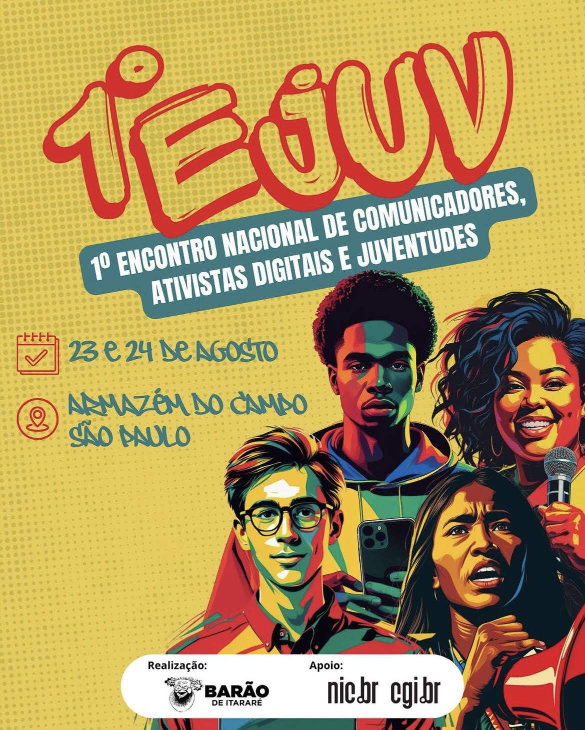O 1° EJUV se apresenta como um espaço de construção de comunicação democrática, combate à desinformação e de fortalecimento de uma mídia popular, soberana e feita pelo povo. Serão dois dias de debates, oficinas, grupos de trabalho e espaços de troca de experiências, voltado a conectar juventudes que comunicam nas redes, nas periferias, nos coletivos e nos territórios. Promovido pelo Centro de Estudos da Mídia Alternativa Barão de Itararé, parceiro da RNCD, o 1° EJUV conta com apoio do Núcleo de Informação e Coordenação do Ponto BR (NIC.br), através do Comitê Gestor da Internet no Brasil (CGl.br). A coordenação científica é de Ergon Cugler (FGV/CNPq), Isabela Rocha (UnB/CAPES) e Gabryella Cardoso (Mackenzie).