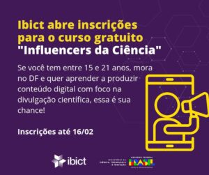 Publicado originalmente em Ibict. Para acessar, clique aqui. O Ibict anuncia a abertura das inscrições para o curso de capacitação “Influencers da Ciência”, voltado para