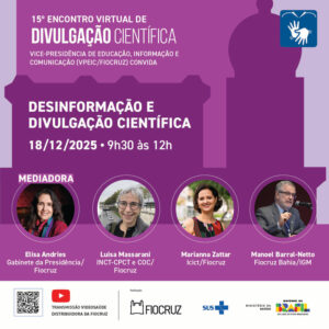 Nesta quinta-feira, 18/12, acontece o 15º Encontro Virtual de Divulgação Científica da Fiocruz, organizado pela Vice-Presidência de Educação, Informação e Comunicação da instituição, com o