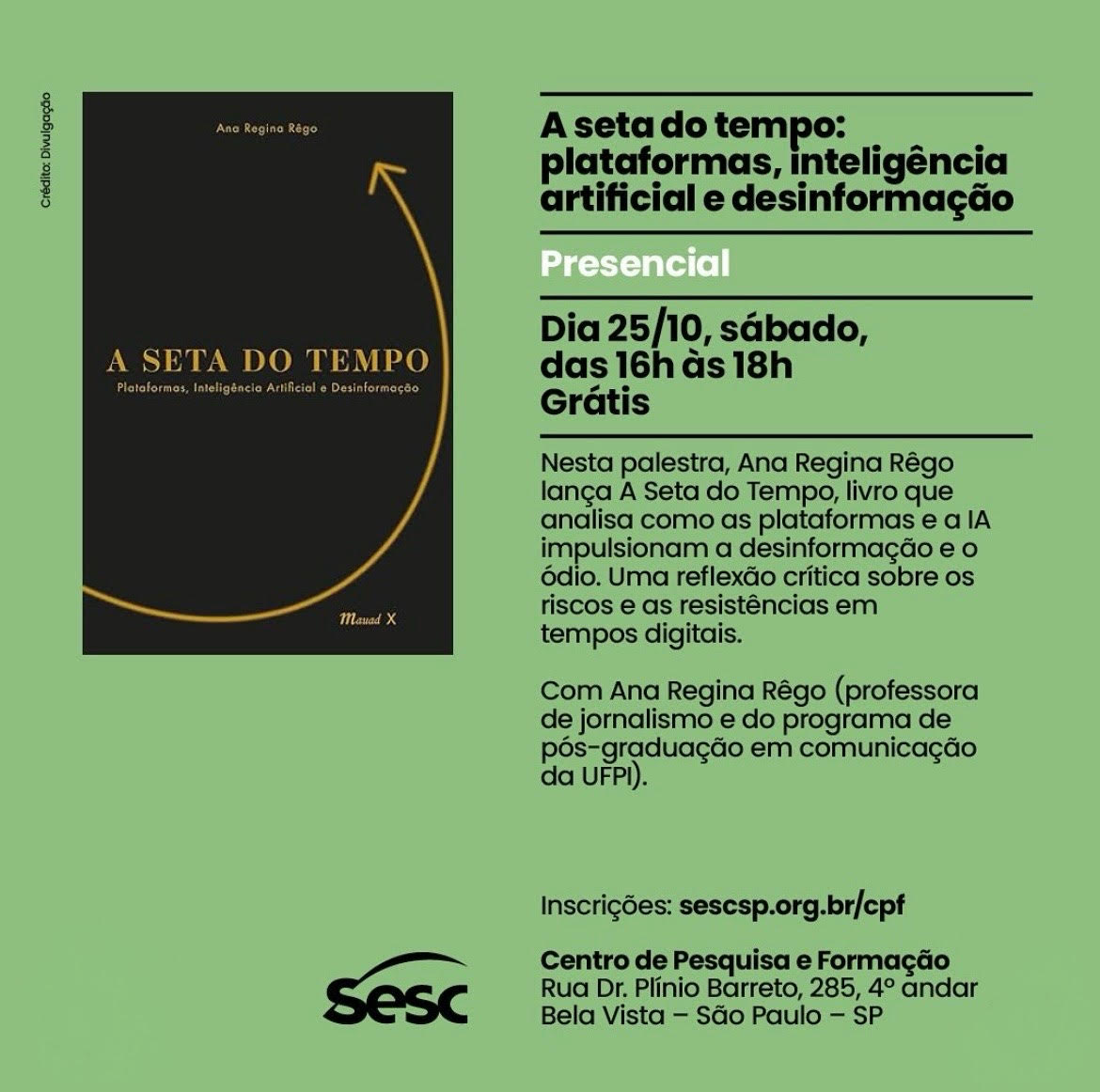 A professora e pesquisadora Ana Regina Rêgo lança no próximo sábado, 25/10, em São Paulo, seu livro mais recente A Seta do Tempo: Plataformas, Inteligência Artificial e Desinformação. Professora do Programa de Pós-Graduação em Comunicação da Universidade Federal do Piauí (UFPI), pesquisadora do CNPQ e criadora da Rede Nacional de Combate à Desinformação, a autora falará sobre as pesquisas que embasaram seu novo livro, editado pela Mauad X. A obra reúne reflexão filosófica e resultados de diversas pesquisas para analisar como as transformações digitais das últimas décadas tornaram a desinformação um dos produtos mais lucrativos da atualidade, e conta ainda com prefácio da professora Marialva Barbosa e posfácio do historiador Roger Chatier.