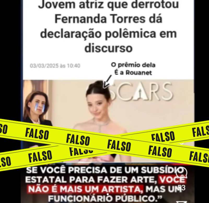 A publicação que atribui a fala de Milei à protagonista de Anora usa o nome e a imagem da atriz Fernanda Torres para passar a ideia de que a atriz brasileira e/ou o filme Ainda Estou Aqui, vencedor do Oscar na categoria melhor filme internacional, foram subsidiados com dinheiro público.