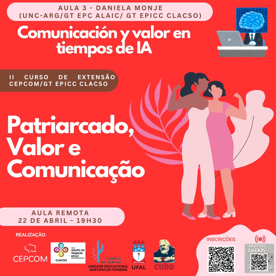 ♀️A terceira aula do II Curso de Extensão CEPCOM/GT EPICC Clacso “Patriarcado, Valor e Comunicação” discutirá amanhã, a partir das 19h30: “Comunicación y valor en tiempos de IA”.