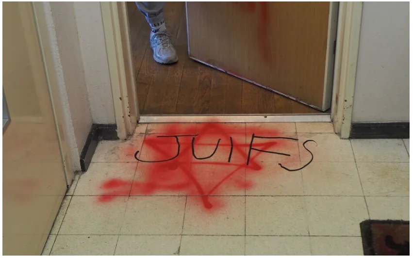 Pichação antissemita, com Estrela de Davi em vermelho e a palavra “judeus” em preto – Imagem: reprodução Le Parisienf