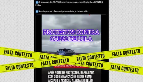 Circula no X (antigo Twitter) um post afirmando que, em Belém, manifestantes reuniram 200 embarcações “contra a COP30 de Lula” no evento chamado “Barqueata da Cúpula dos Povos”. Falta contexto. O protesto pedia justiça climática e não era direcionado a um único líder.