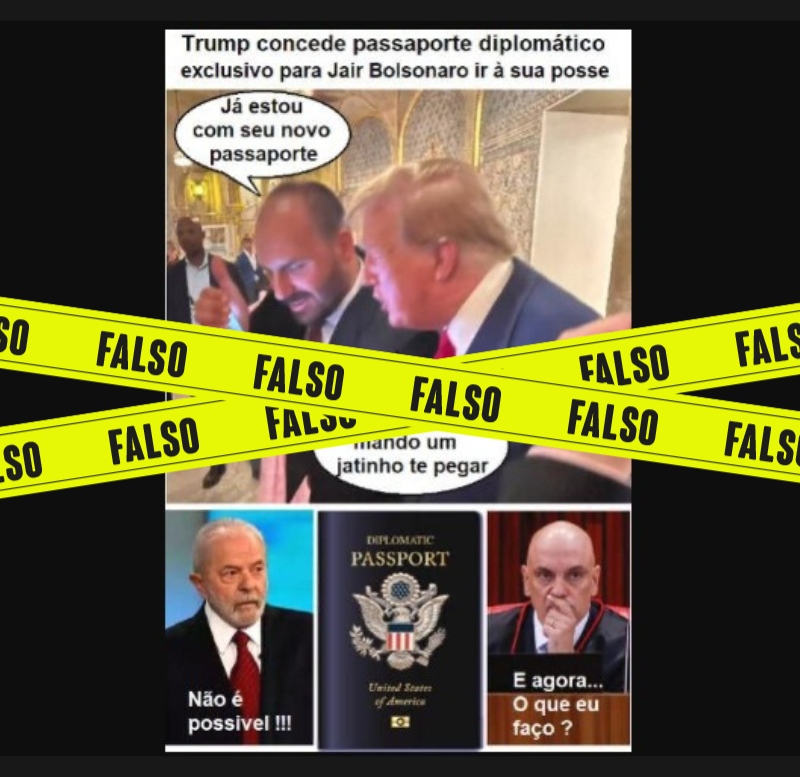 Circula pelas redes sociais a alegação de que o ex-presidente brasileiro Jair Bolsonaro (PL) ganhou um passaporte diplomático americano. Publicações afirmam que o presidente eleito dos Estados Unidos, Donald Trump, concedeu o documento a Bolsonaro. Nas redes sociais, alega-se que o documento permitiria a ida do brasileiro à posse de Trump, em janeiro de 2025. Algumas publicações alegam também que o passaporte evitaria a prisão de Bolsonaro. É falso.
