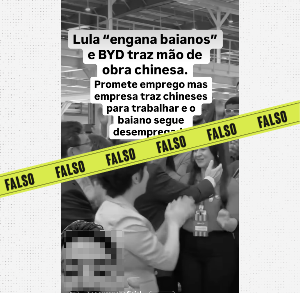 Circula no Instagram e no WhatsApp um post afirmando que a fabricante de carros elétricos Build Your Dreams (BYD) pretende levar 10 mil trabalhadores chineses para Camaçari (BA). “Promete emprego mas a empresa traz chineses para trabalhar e o baiano segue desempregado”, diz trecho da legenda. É falso.