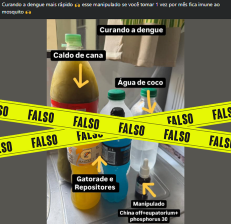 Circulam nas redes sociais posts afirmando que ingerir bebidas como caldo de cana, água de coco e isotônicos acrescidas de um medicamento manipulado com os componentes Eupatorium e Phosphorus poderiam curar a dengue ou até prevenir a doença. É falso.