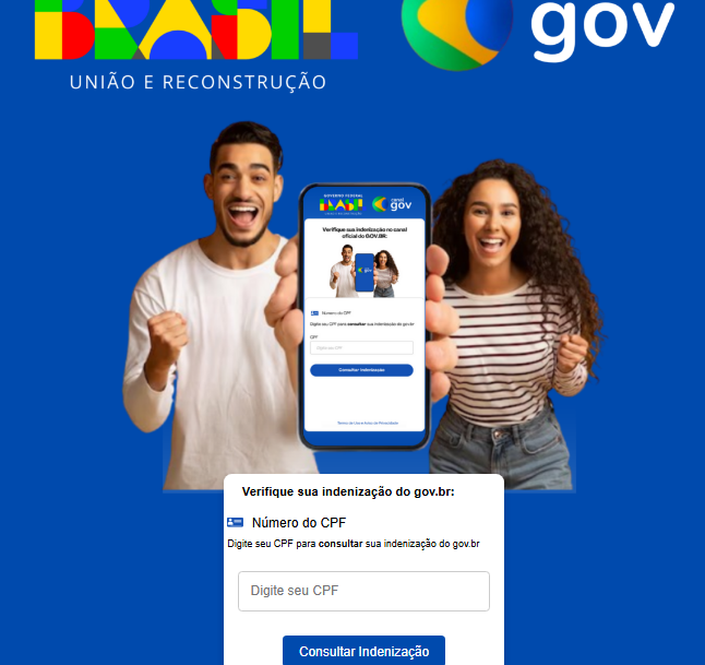 Esse mesmo layout que imita um portal oficial já foi, inclusive, visto em outros golpes analisados pela Lupa. Como já foi observada em outras fraudes, se estivesse funcionando corretamente, essa página deveria permitir que o usuário pudesse digitar seu CPF para conferir a – falsa – indenização.