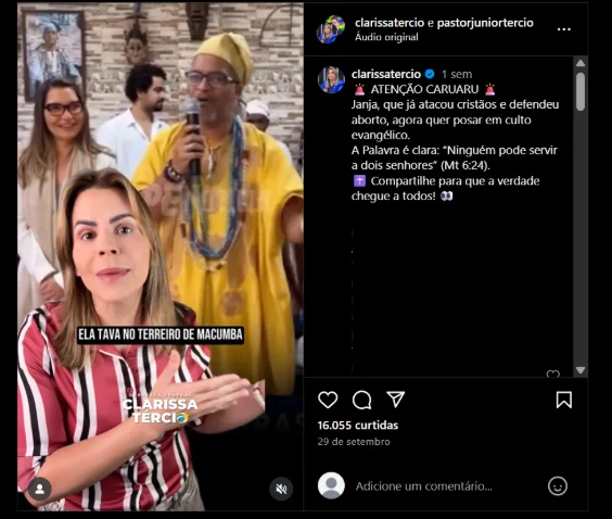 A deputada federal evangélica Clarissa Tércio (PP-PE) usou seu perfil no Instagram para atacar a Primeira Dama Janja da Silva, que se encontrou com mulheres evangélicas e participou de culto durante visita a Caruaru (PE), no último 30 de setembro. De acordo com a deputada, “dias atrás ela estava no terreiro de macumba, e agora quer posar de ‘amiga das evangélicas’”.