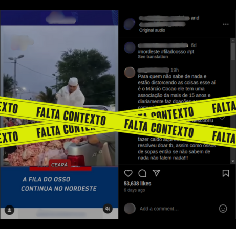 Uma busca reversa pelas imagens indicou que o vídeo foi originalmente postado por um morador de Fortaleza-CE chamado Márcio Cocão, em seu perfil no Instagram, durante uma distribuição de ossadas. Ele lidera uma associação que realiza trabalhos sociais desde 2010.