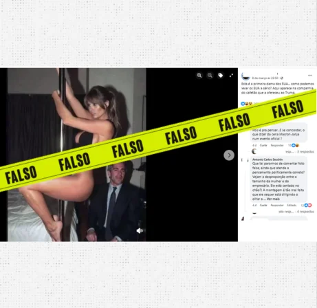 Uma imagem que circula no Facebook mostra a primeira-dama dos Estados Unidos, Melania Trump, dançando em um pole dance na companhia de Jeffrey Epstein (1953-2019), empresário estadunidense condenado por abuso sexual. É falso.