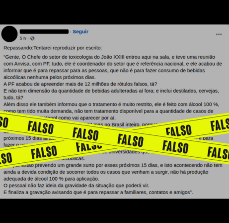 Uma publicação no Facebook reproduz um áudio que circula no WhatsApp, o qual alega que o chefe do setor de toxicologia do Hospital João XXIII, de Belo Horizonte teve uma reunião com a Anvisa e com a Polícia Federal (PF), onde ficou decidido que o consumo de todas as bebidas alcoólicas deveria ser interrompido pelos próximos dias. Também diz que a PF havia acabado de apreender mais de 12 milhões de rótulos falsos de bebidas adulteradas por metanol. É falso