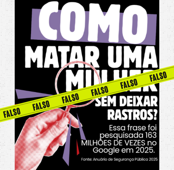 Circulam no Facebook, Instagram e no WhatsApp posts afirmando que, em 2025, a frase “como matar uma mulher sem deixar rastros” foi pesquisada 163 milhões de vezes no Google. É falso.