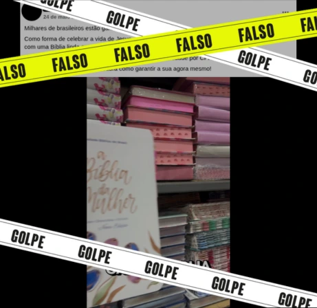 Publicação nas redes sociais oferece uma Bíblia gratuita para quem clicar no link “saiba mais” e, em seguida, responder um quiz. É falso. Trata-se de um golpe.