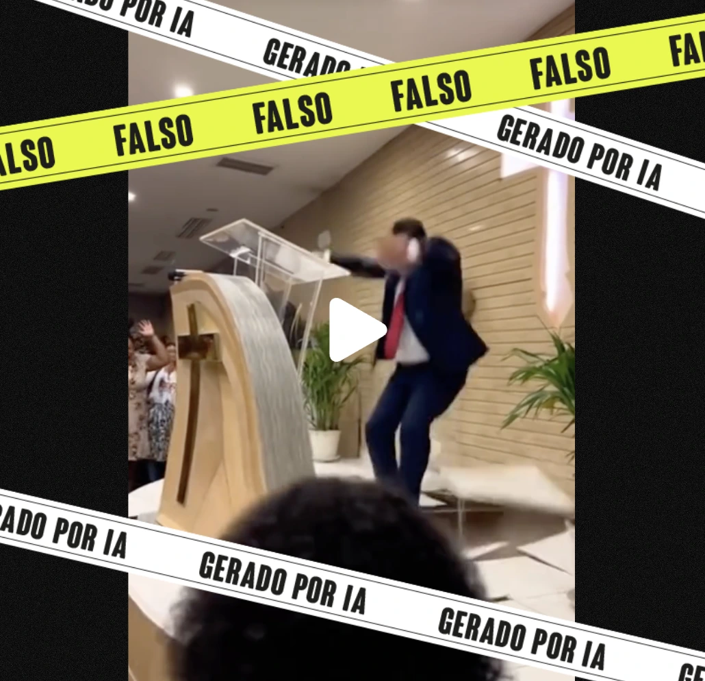 Circula no Instagram e no X um vídeo em que um suposto pastor que, em um momento de pregação, clama ao Senhor para enviar para o inferno “tudo o que for de Satanás”. No mesmo instante, um buracao se abre no meio do chão e o pastor cai nele. É falso. O vídeo foi criado com inteligência artificial (IA).