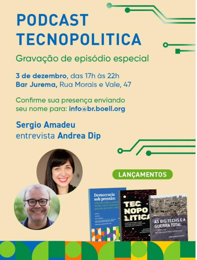 Nessa quarta-feira, 03/12, às 17h, acontecerá um bate-papo com o escritor e professor Sérgio Amadeu e a jornalista Andrea Dip no bar Jurema, na Lapa, gravando um episódio especial do podcast Tecnopolítica. Além da gravação ao vivo, serão lançados três livros: Tecnopolítica: um guia para entender a relação entre poder, economia, cultura, novas tecnologias e a luta democrática contra as Big Techs, Democracia sob pressão: reflexões sobre a extrema direita com as chaves do passado, presente e futuro e As big techs e a guerra total: O complexo militar-industrial-dataficado.