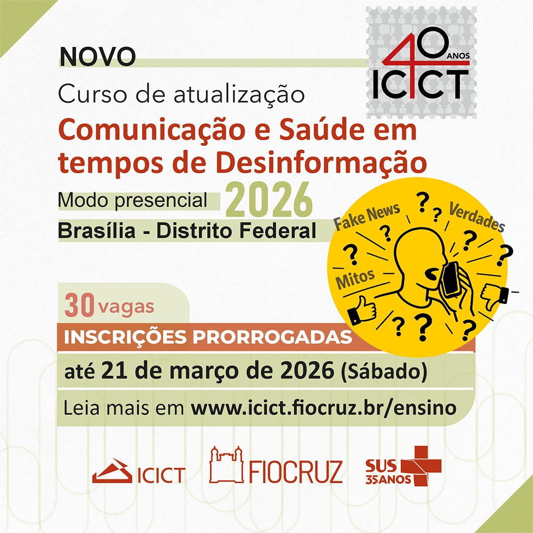 O Instituto de Comunicação e Informação Científica e Tecnológica em Saúde da Fundação Oswaldo Cruz (Icict/Fiocruz) está com inscrições abertas para a primeira edição do Curso de Atualização em Comunicação e Saúde em Tempos de Desinformação. Voltada aos profissionais de comunicação vinculados ao Ministério da Saúde, a atualização será oferecida presencialmente, pela primeira vez, na Fiocruz de Brasília. As aulas serão presenciais, sempre às sextas-feiras. O prazo de inscrição vai até o próximo sábado, 21 de março, e as aulas serão ministradas no período de abril a julho de 2026.
