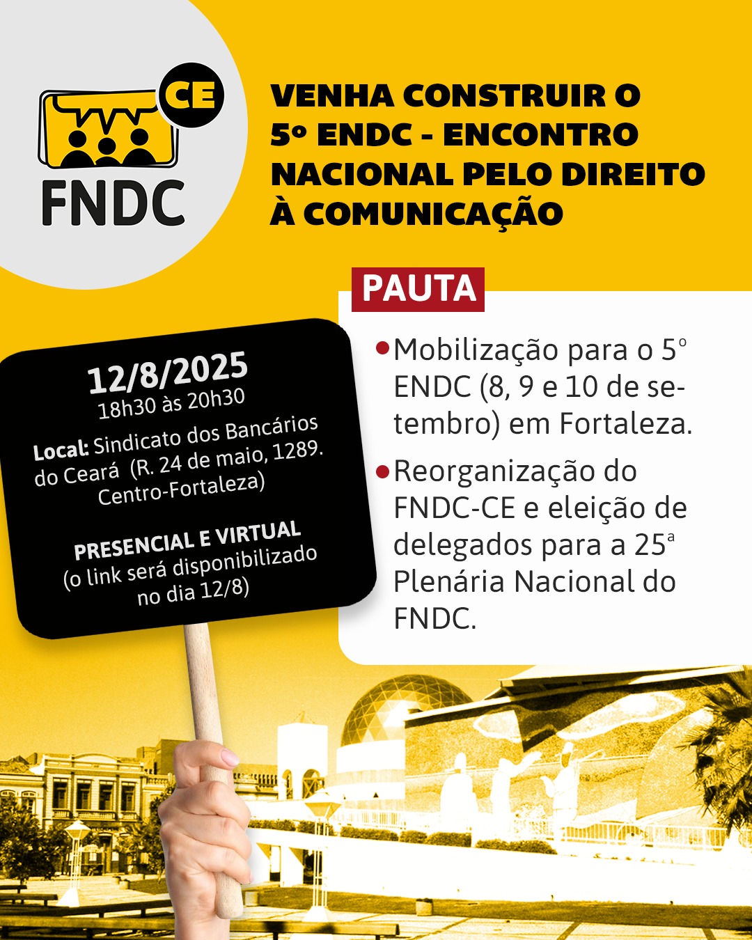 No próximo dia 12 de agosto, às 18h30, será realizado, no Sindicato dos Bancários de Fortaleza, um encontro organizativo preparatório para o V Encontro Nacional pelo Direito à Comunicação, que acontecerá em setembro, na capital cearense.