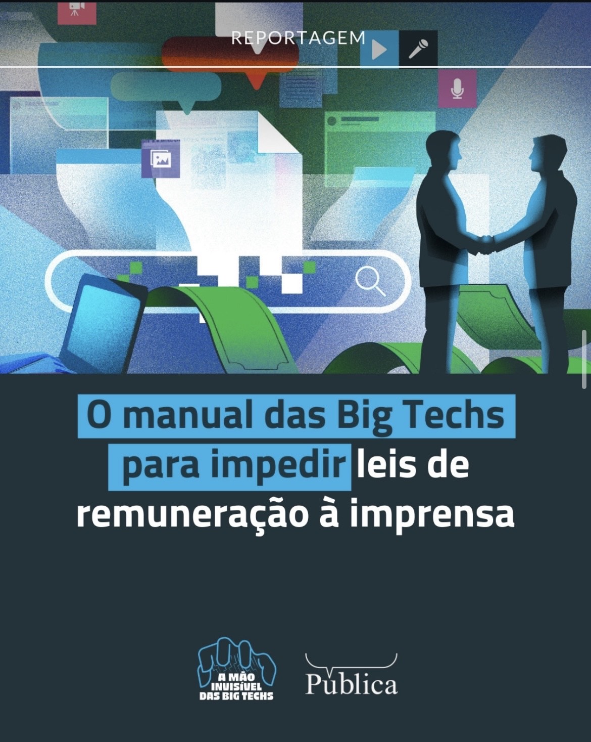 A Agência Pública divulgou mais uma parte da série de reportagens “A Mão Invisível das Big Techs”, uma investigação transnacional liderada pelo veículo em parceria com o Centro Latino-Americano de Investigação Jornalística (CLIP). As duas novas reportagens publicadas se debruçam sobre dois temas: o lobby do Google e do Facebook contra legislações que pretendem exigir pagamento pelo uso de conteúdo jornalístico, e as estratégias utilizadas pelo Google para conquistar o apoio da imprensa e evitar a regulação.