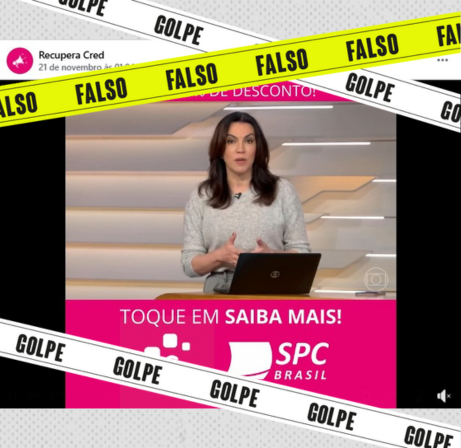 Circulam, no Facebook, publicações que mostram a jornalista Ana Paula Araújo, apresentadora do Bom Dia Brasil, da TV Globo, noticiando a possibilidade de renegociar dívidas com até 99% de desconto. As postagens contêm um link que encaminha o usuário para outro site. É golpe.