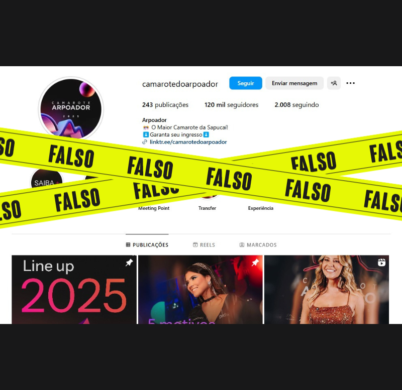 Um perfil no Instagram simula a página oficial do Camarote Arpoador, reproduzindo o nome, cores e a identidade visual do espaço VIP do Sambódromo da Marquês de Sapucaí, no Rio de Janeiro, para vender ingressos com preços abaixo do mercado. É falso. Trata-se de um golpe.