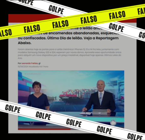 Além disso, o site golpista analisado pela Lupa exibe um trecho antigo do Jornal da Record, transmitido em 22 de setembro de 2023. Na reportagem, foi noticiado um leilão organizado pela Receita Federal, envolvendo mais de 6 mil produtos apreendidos no Porto de Santos, no litoral de São Paulo, devido a fraudes na importação.