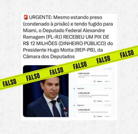 Circula nas redes sociais um print de um documento que mostra dois pagamentos nos valores de R$ 3 milhões e R$ 4 milhões e um empenho (reserva do dinheiro) de R$ 5 milhões para fundos municipais de saúde, realizados em novembro deste ano. Legendas que acompanham a imagem afirmam que as transferências foram feitas pelo presidente da Câmara dos Deputados, Hugo Motta (Republicanos-PB), para o deputado federal Alexandre Ramagem (PL-RJ), que está foragido. É falso.
