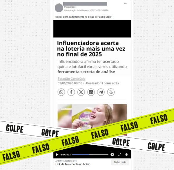 Anúncios pagos no Facebook, Instagram e Threads promovem ferramentas que prometem prever resultados de loterias e aumentar as chances de ganhar prêmios. As peças publicitárias usam a imagem da influenciadora e ex-BBB Paulinha Leite, conhecida por acumular prêmios em apostas da Caixa Econômica Federal, como a quina que acertou na última Mega da Virada, para sugerir, de forma enganosa, que ela teria promovido o método, apresentando como o “segredo” para conquistar os prêmios. É falso e trata-se de um golpe.