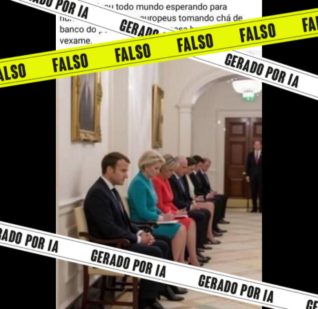 Circula nas redes sociais uma imagem em que alguns líderes europeus — entre eles o presidente da França, Emmanuel Macron, a chefe da Comissão Europeia, Ursula von der Leyen, a premiê da Itália, Giorgia Meloni — aparecem sentados em um banco na Casa Branca supostamente esperando para falar com o presidente dos Estados Unidos, Donald Trump.
