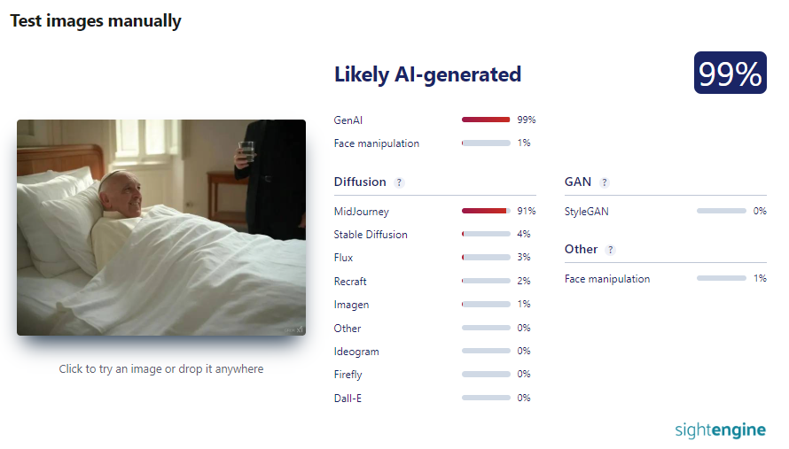 Site SightEngine alega que o conteúdo foi criado com inteligência artificial. Foto: Reprodução