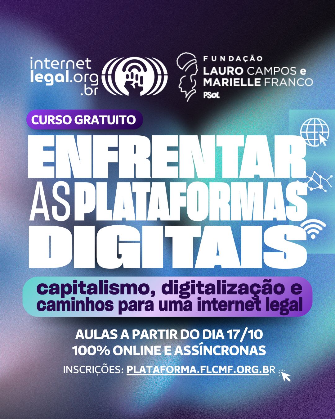 ❗❗📲O curso Enfrentar as plataformas digitais: capitalismo, digitalização e caminhos para uma internet legal é uma realização da campanha Internet Legal, em parceria com a Fundação Lauro Campos e Marielle Franco. As aulas estarão todas disponíveis a partir do dia 17 de outubro – Dia Nacional de Luta pela Democratização da Comunicação – e ocorrem de forma 100% online e gratuita, podendo ser assistidas de maneira assíncrona. Ao concluírem o curso, participantes terão acesso a um certificado.