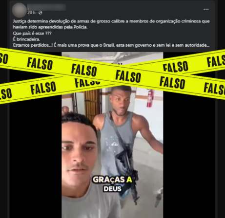 Circula nas redes sociais um vídeo que mostra homens afirmando que conseguiram retirar suas armas de uma delegacia. Segundo a legenda do post, a Justiça determinou a devolução das armas de grosso calibre aos criminosos. É falso.