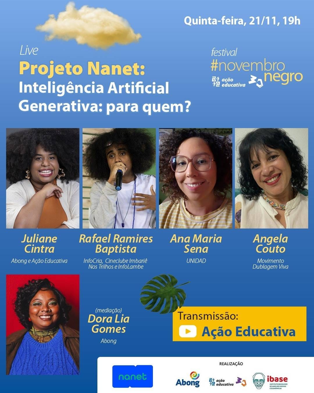 ???? O Projeto Nanet, promovido pela Ação Educativa em parceria com Abong e Ibase, realizará uma conversa sobre os impactos da inteligência artificial generativa na sociedade. Artistas, ativistas e pesquisadoras vão discutir como essa tecnologia, que parece democratizar a criação, esconde desafios como desemprego, desinformação e apropriação indevida de materiais criativos.