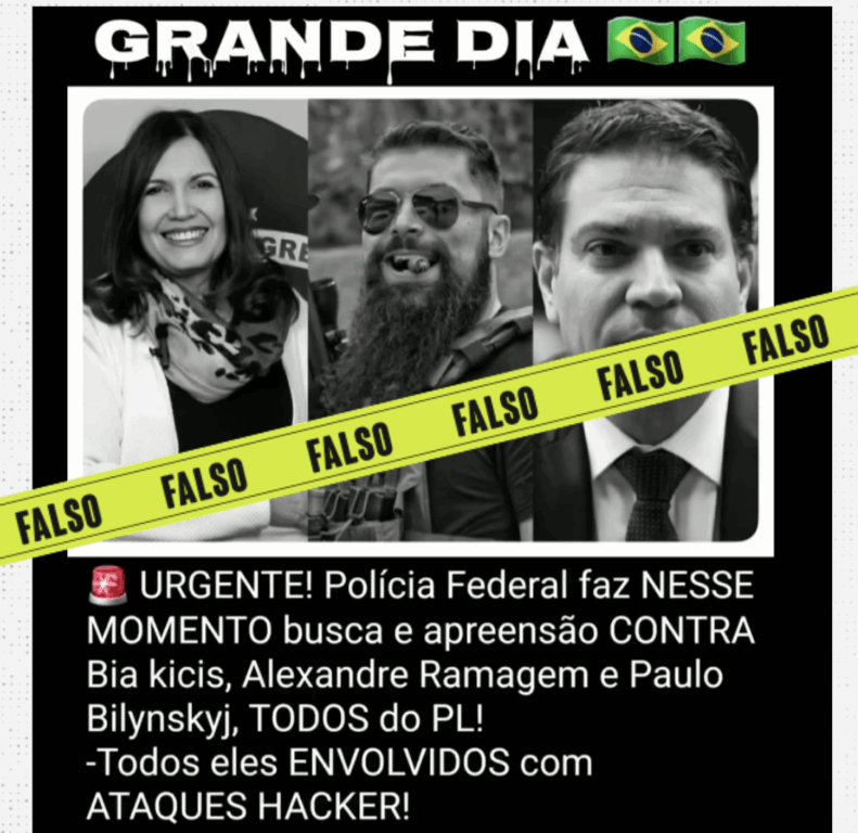 Circula no Facebook um post que afirma que a Polícia Federal (PF) estaria realizando “nesse momento” uma operação de busca e apreensão contra os deputados federais Bia Kicis (PL-DF), Alexandre Ramagem (PL-RJ) e Paulo Bilynskyj (PL-SP), sob suspeita de envolvimento em ataques hackers. É falso.