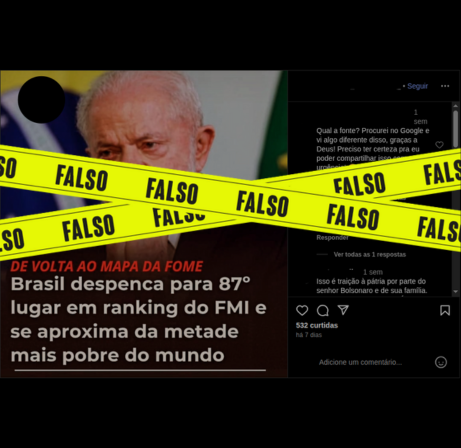 Uma publicação no Instagram alega que o Brasil está de volta ao Mapa da Fome e que o país despencou para o 87º lugar em ranking do FMI, se aproximando da metade mais pobre do mundo. É falso.