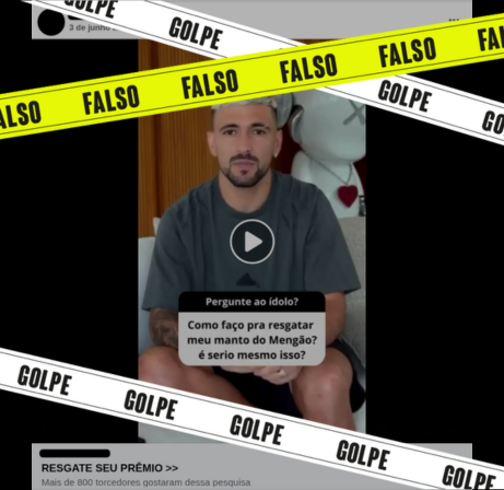 Post nas redes sociais traz um vídeo com o jogador de futebol Giorgian De Arrascaeta, do Flamengo, no qual ele afirma que foi criado um quiz com questões sobre o clube e, quem participar, poderá ganhar uma camiseta oficial do time. Para isso, é preciso clicar em “saiba mais”. É falso. Trata-se de um golpe.