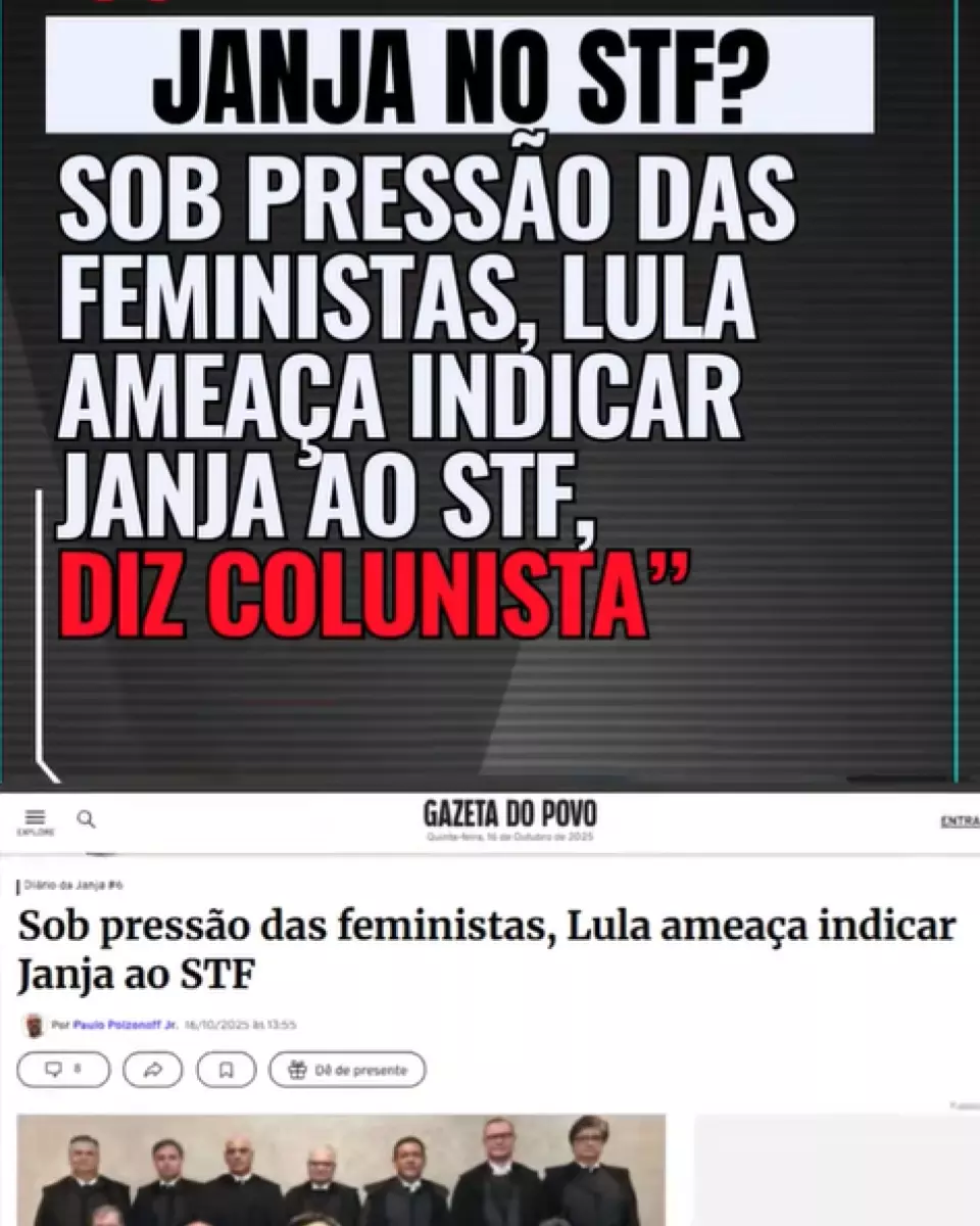 Não é verdade que a primeira-dama Rosângela da Silva, a Janja, será indicada pelo presidente Lula (PT) ao STF após pressão de grupos feministas. Em nota, a Secom (Secretaria de Comunicação Social) da Presidência desmentiu o boato. A alegação compartilhada pelas peças de desinformação tem origem em uma coluna satírica publicada pelo jornal Gazeta do Povo.