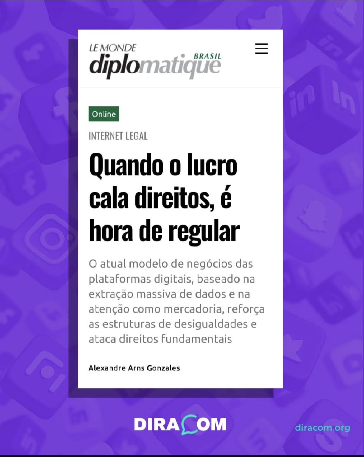 O Le Monde Diplomatique Brasil publicou um artigo abordando o modelo de negócios das plataformas digitais, a violação de direitos fundamentais e a necessidade de regulação. Denominado “Quando o lucro cala direitos, é hora de regular”, foi produzido por Alexandre Arns Gonzales, que integra a organização Direito à Comunicação e Democracia (DiraCom) e é consultor da Coalizão Direitos na Rede pelo GT de Regulação de Plataformas.