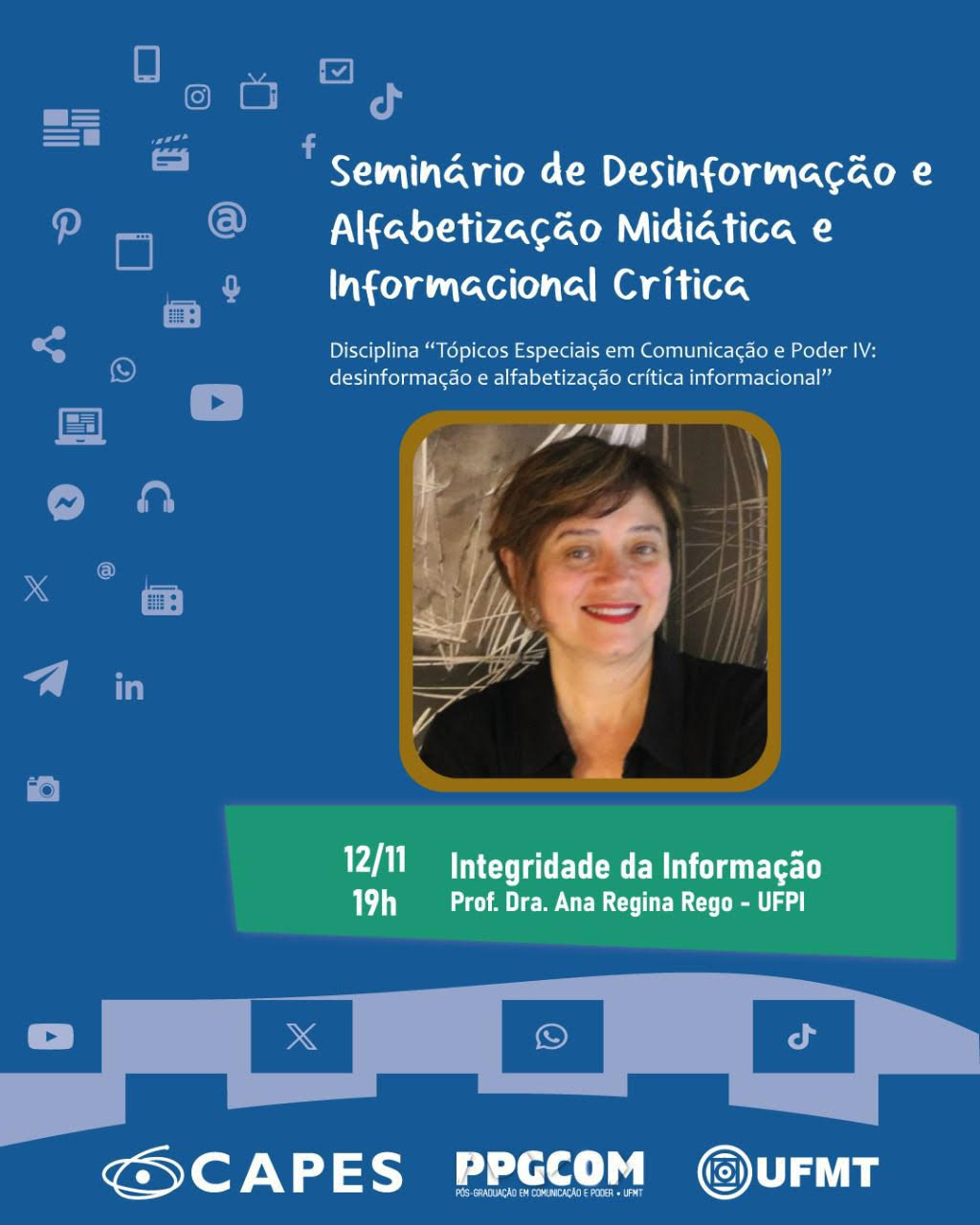 Essa quarta-feira o “Seminário de Desinformação e Alfabetização Midiática e Informacional Crítica”, promovido pelo Programa de Pós-Graduação em Comunicação e Poder da Universidade Federal do Mato Grosso (PPGCOM/UFMT) recebe a docente e pesquisadora Ana Regina Rego, da Universidade Federal do Piauí (UFPI). A professora, que é fundadora e coordenadora da Rede Nacional de Combate à Desinformação (RNCD), abordará o tema “integridade da informação”.