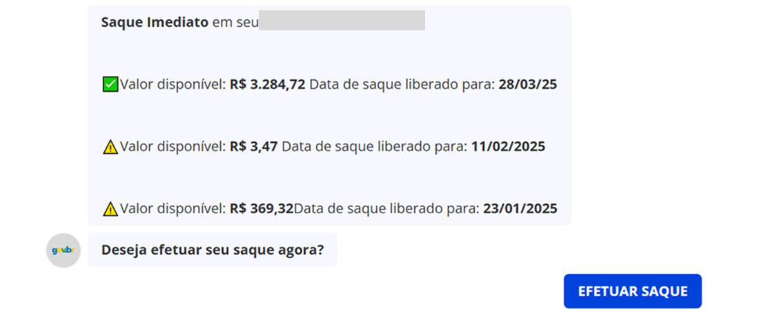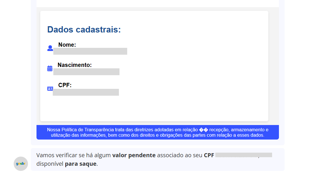 Durante o processo, os golpistas solicitam dados pessoais como nome, data de nascimento e CPF. Após essa etapa, uma “consulta” é simulada e, em seguida, os golpistas informam que há valores disponíveis para saque, disponibilizando um botão para que o usuário realize a suposta operação.