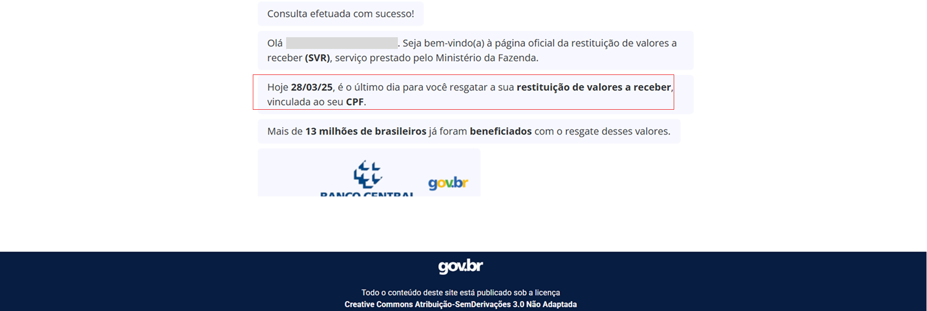 Na sequência, após a consulta do CPF, o site fraudulento reforça, mais uma vez, que se trata de um serviço oficial, alegando ser do “Ministério da Fazenda” — quando, na verdade, o Sistema Valores a Receber é administrado pelo Banco Central. Além disso, a página afirma que a data da consulta — neste caso, hoje (28) —, é a última para “resgatar” os valores, criando uma falsa sensação de urgência, recurso comum em tentativas de golpe para pressionar potenciais vítimas.