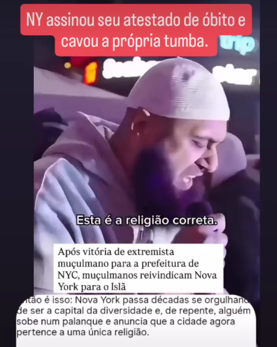 Não foi gravado após a vitória do democrata Zohran Mamdani nas eleições para a prefeitura de Nova York o vídeo que mostra um ato em defesa do islamismo na Times Square. O registro compartilhado pelas peças de desinformação é de 2023 e não tem relação com Mamdani.